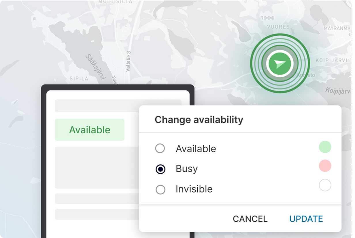 Medarbejdere opdaterer deres status via mobilapp: tilgængelig, optaget, arbejder med højspænding, arbejder med lavspænding, på ferie eller privat tid.