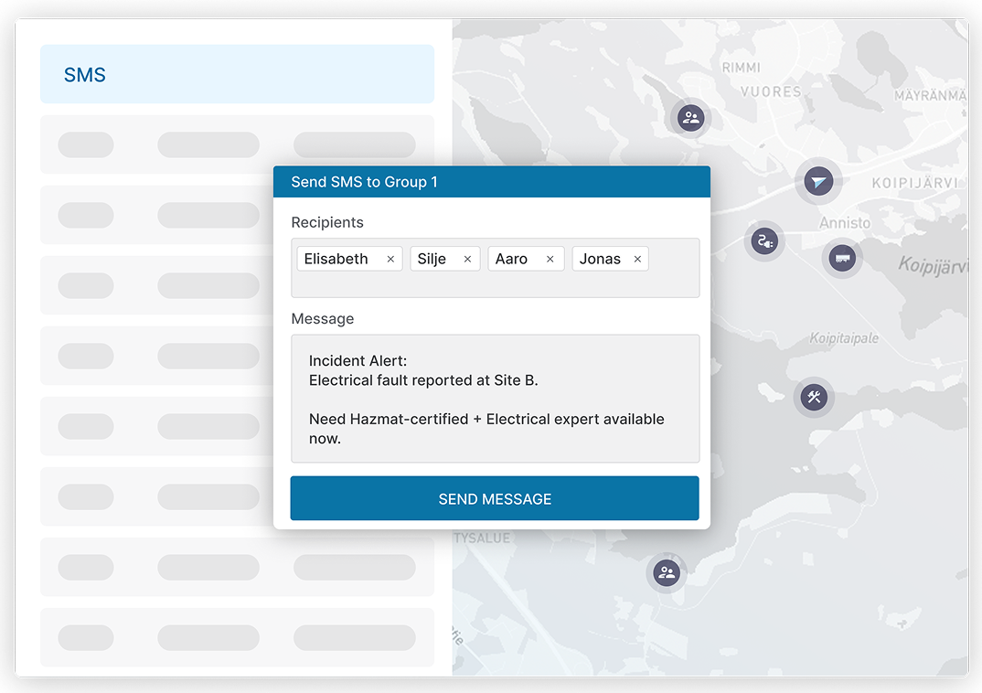 Opret hurtigt kommunikationsgrupper og send SMS-advarsler baseret på lokation, tilgængelighed eller kompetencer.
